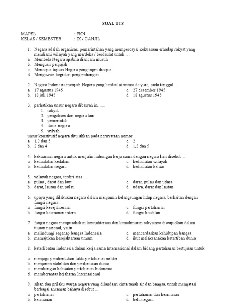 Selalu mengutamakan kepentingan negara di atas kepentingan pribadi b. May 13, 2021 · tag: Aug 06, 2021 · soal pkn kelas 9 semester 1 soal pilihan ganda. Pada kesempatan kali ini kita lanjutkan lagi latihan soalnya yaa, yaitu mapel ppkn kelas 9 smp/ mts semester 2 bab 6 tentang bela negara dalam konteks negara kesatuan republik indonesia. Aug 01, 2021 · tag: