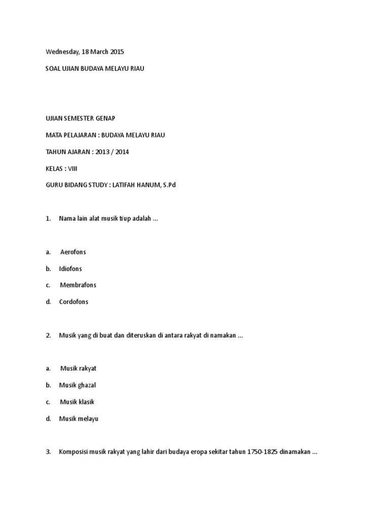 bmr (budaya melayu riau) semester 1 ganjil smp kelas 7; soal ujian pas bmr kelas 2 sd. soal budaya melayu riau kelas 11 beserta jawaban guru ilmu sosial. Budaya melayu riau bab 8 lam riau. Materi bahasa jawa kelas 10 semester 1 kurikulum 2013 guru ilmu.